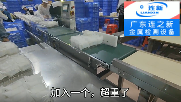 廣東連之新自動重量選別機現場使用圖片,重量超輕或超重都能自動選擇剔除。